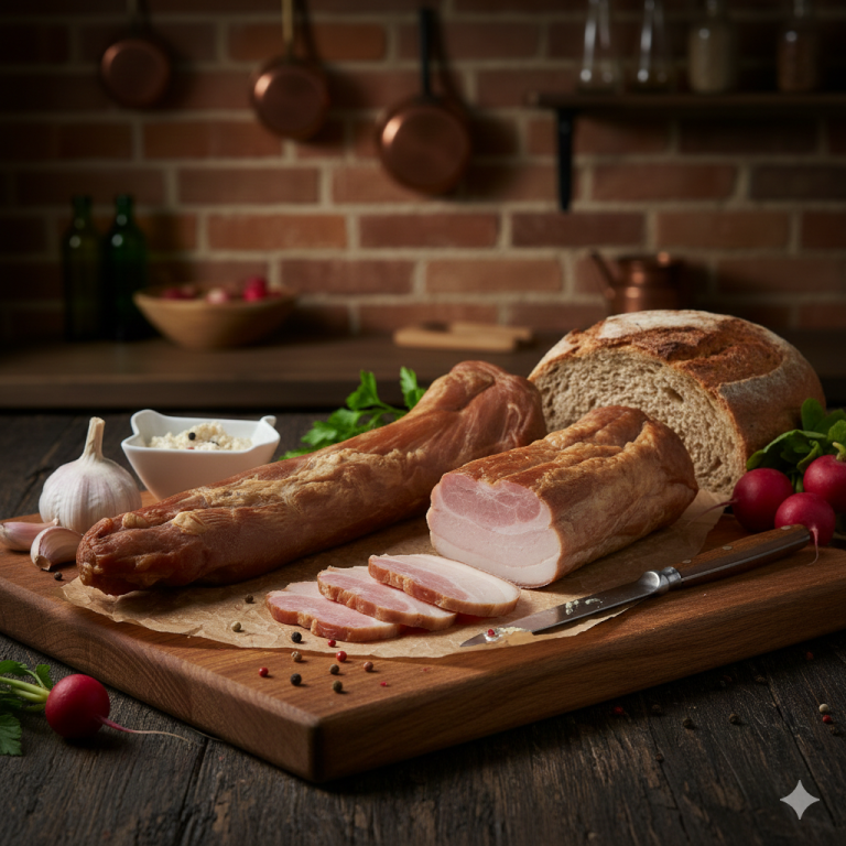 Proces przygotowania naszych wędlin zaczyna się od starannego wyboru mięsa z lokalnych hodowli. Peklowanie w naturalnych ziołach oraz wędzenie w dymie z drewna olchowego i bukowego trwa wiele godzin, co nadaje naszym wyrobom niepowtarzalny aromat i głębię smaku, której nie znajdziesz w masowej produkcji.